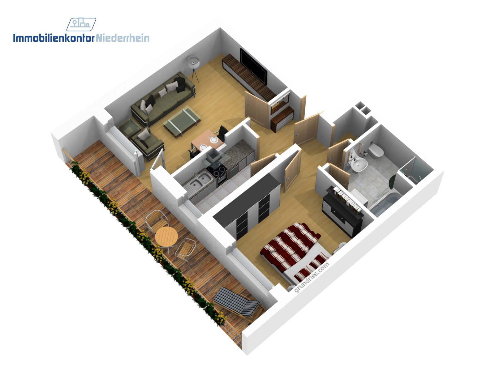 Die Wohnung verfügt über Diele, Abstellraum, Bad mit Wanne und Dusche sowie Waschmaschinenstellplatz, Schlafzimmer, Küche und Wohnbereich mit Zugang zum grossen Südbalkon.
